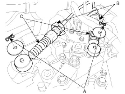 7. Remove the control cable assembly (C) by removing the snap pins (A) and clips (B).