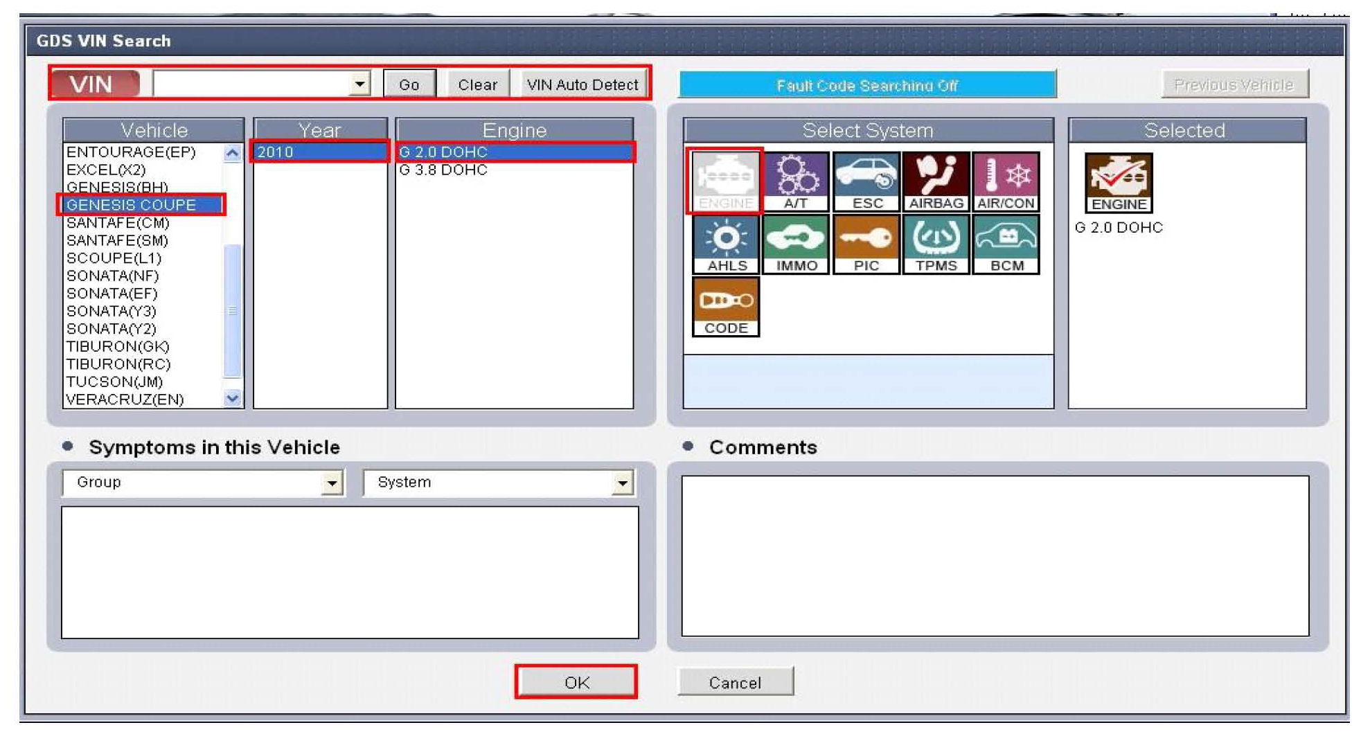 2. Enter the vehicle information by pressing the VIN Auto Detect button, entering the vehicle's VIN or selecting the vehicle model, model year, engine/fuel type and ENGINE as the system and then click OK.