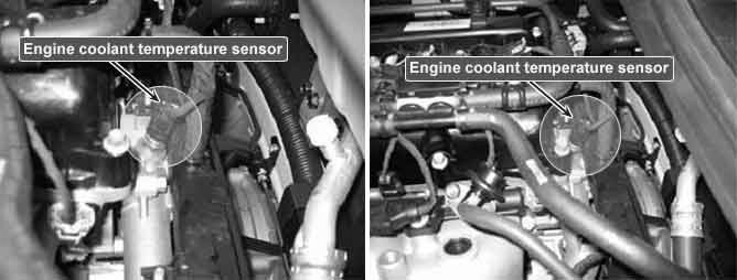 Engine coolant temperature sensor is located in the engine coolant passage of the cylinder head for detecting the engine coolant temperature. It contains negative type themistor whose resistance value is in inverse proportion to temperature. Resistance of water sensor that varies with temperature makes signal voltage of A/C ECU change. In this way A/C ECU detects temperature. Signal of water sensor is used for cold engine lockout control - When the driver operates the heater before the engine is warmed up enough, to prevent driver from unpleasantness of cold air. the heater control unit reduces blower motor speed until coolant temperature reaches the threshold value.