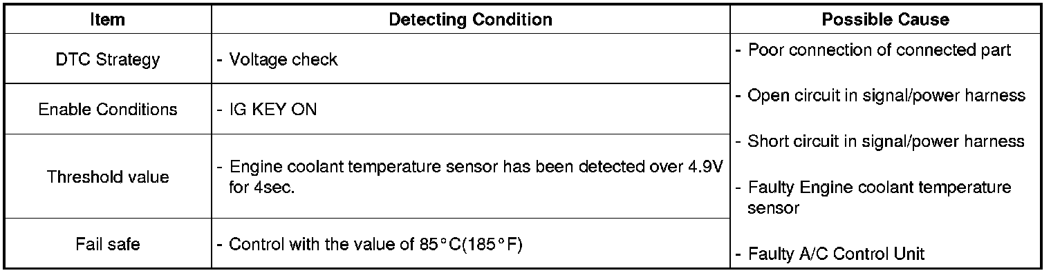 Air conditioner Control Module sets DTC B1202 if Engine coolant temperature sensor has been detected over 4.9 V for 4 sec.