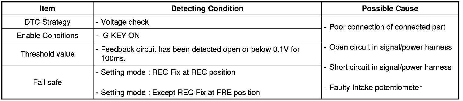 Airconditioner Control Module sets DTC B1208 if the Feed Back signal of Intake Actuator has been detected open or below 0.1 V for 100 ms.