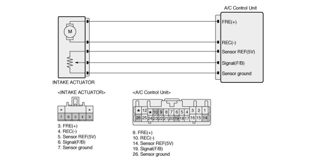 It contains intake motor that changes intake door position and potentiometer that monitors position of intake door. When driver operates the intake switch, ECU receives mode signal from intake switch and operates intake door motor to turn intake door to intended position. (with FRE mode signal, intake door is closed and with REC mode signal, intake door is opened)