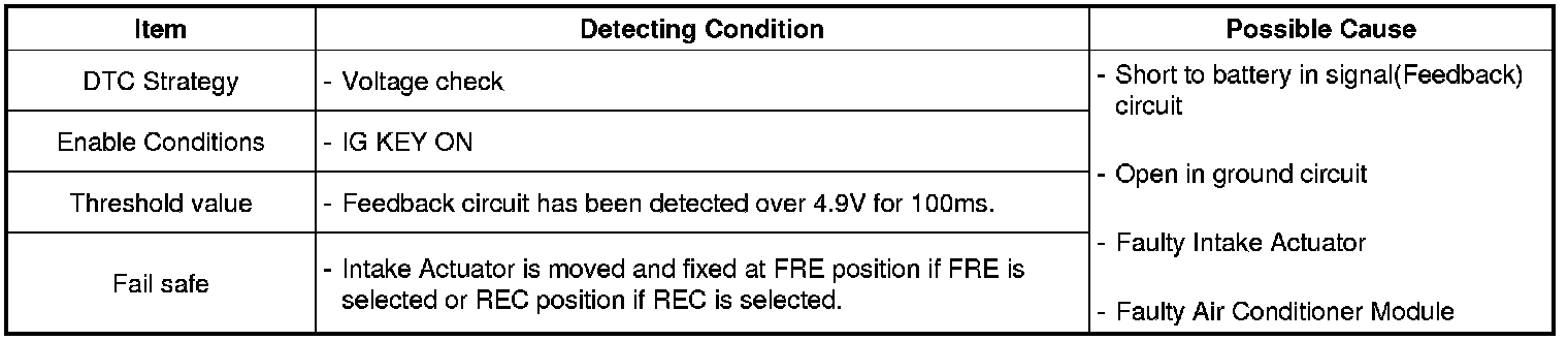 Airconditioner Control Module sets DTC B1209 if the Feed Back signal of Intake Actuator has been detected over 4.9 V for 100ms.