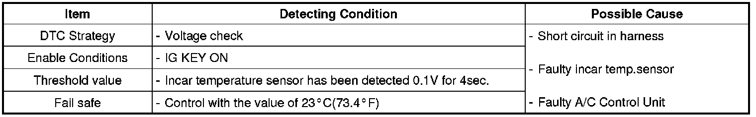 Air conditioner Control Module sets DTC B1233 if Incar temperature sensor has been detected below 0.1 V for 4 sec.