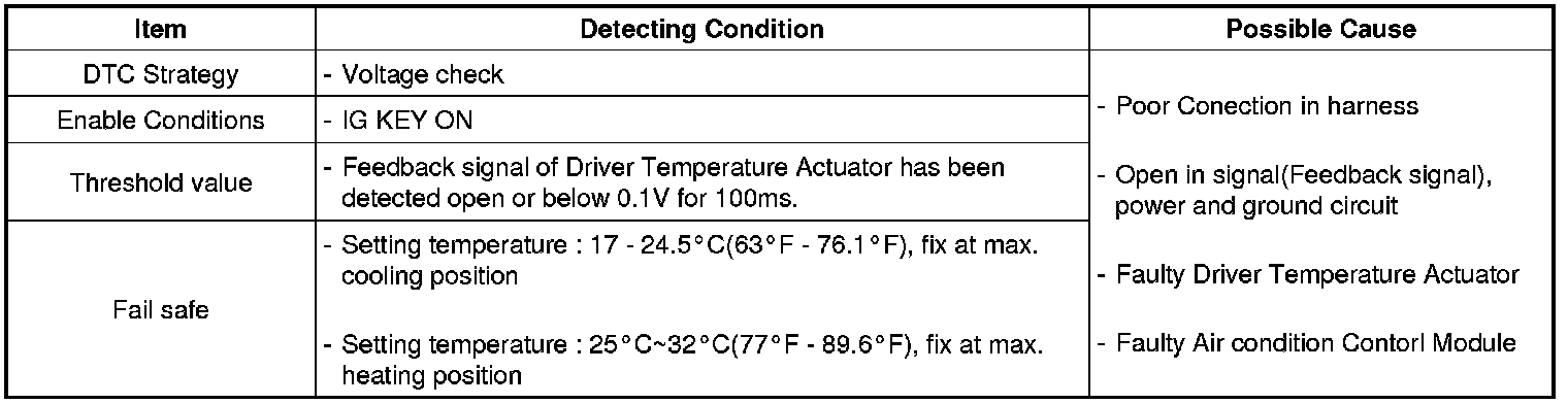 Air conditioner Control Module sets DTC B1245 if Feedback signal of Driver Temperature Actuator has been detected open or below 0.1 V for 100ms.
