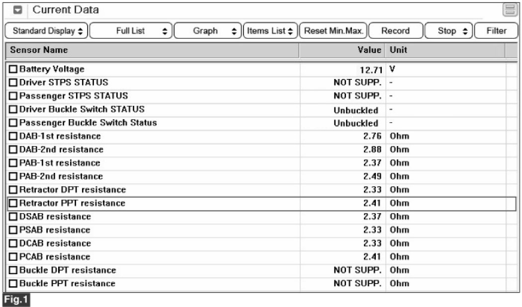 3. Monitor the "Pretensioner front-Passenger resistance" parameter on the Scantool.