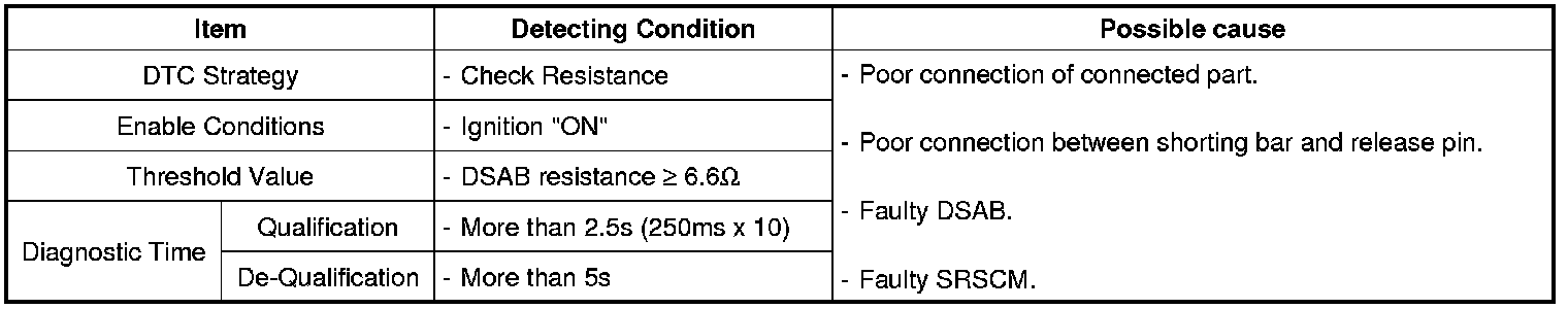 The SRSCM sets DTC B1378 if the measured resistance value of DSAB circuit is more than the threshold value.
