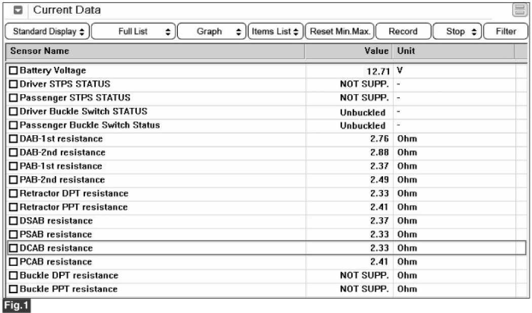 3. Monitor the "Curtain airbag front-Driver resistance" parameter on the Scantool.