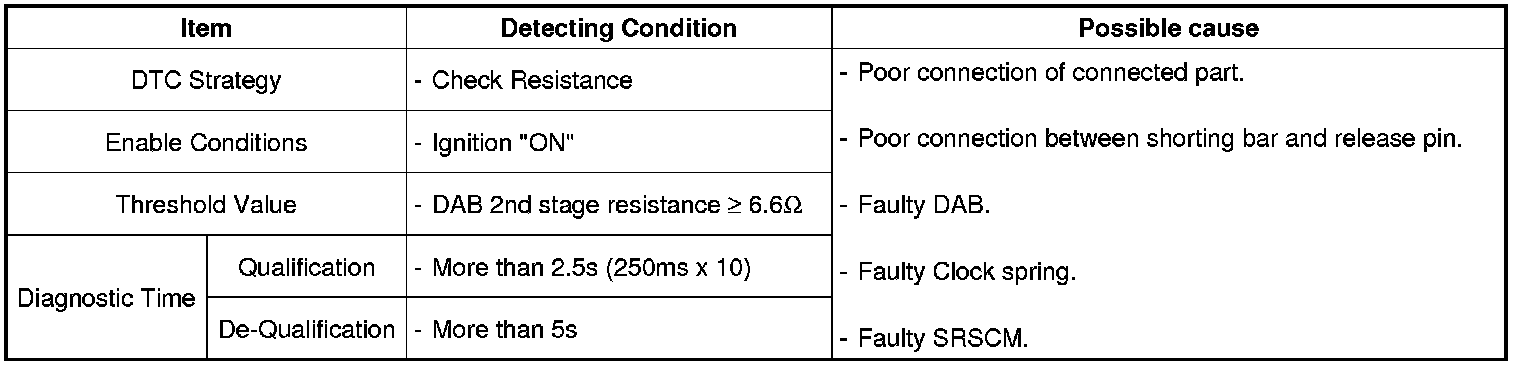 The SRSCM sets DTC B1481 if the measured resistance value of DAB circuit is more than the threshold value.