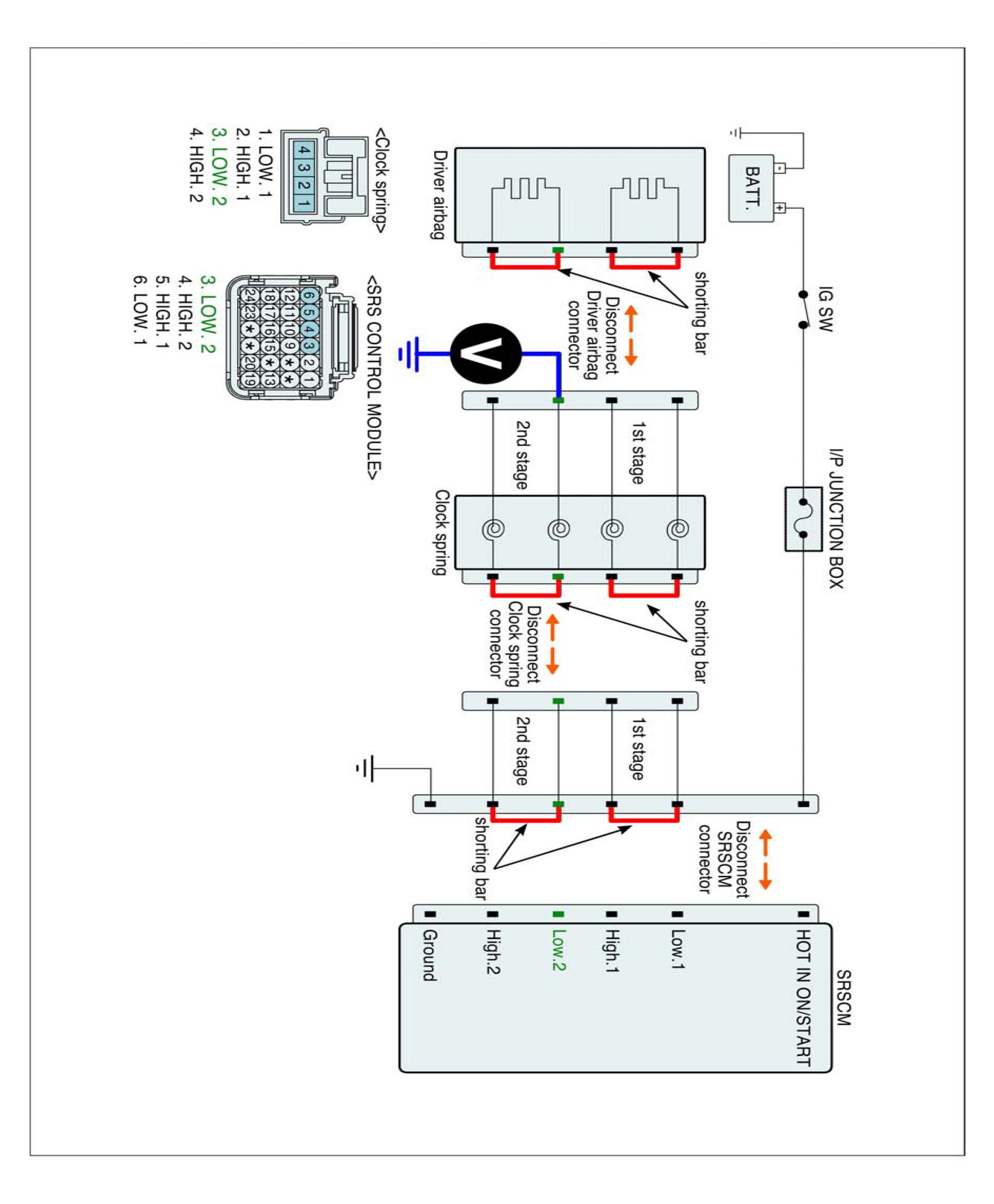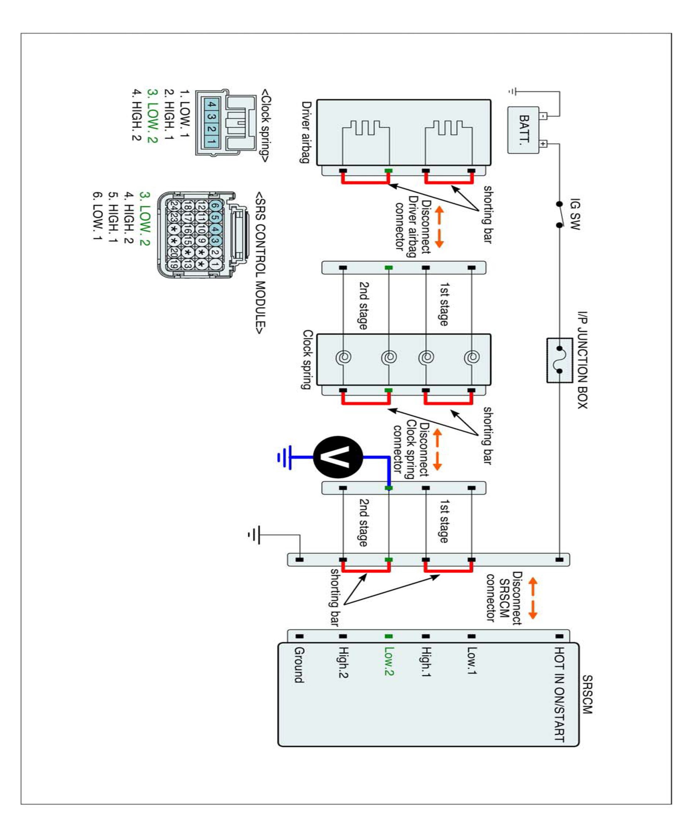 5. Measure Voltage between terminal "Low.2" or "High.2" of the clock spring harness connector and chassis ground.