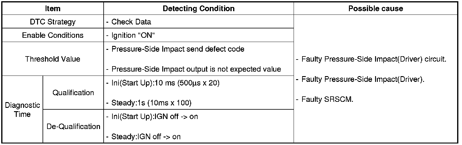 The SRSCM sets DTC B1739 if there is any fault in Pressure-Side Impact (Driver) circuit.