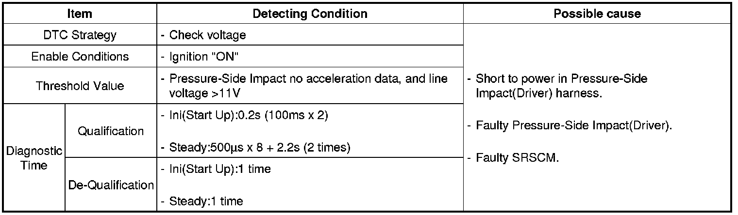 The SRSCM sets DTC B1741 if there is short to power harness in Pressure-Side Impact (Driver) harness.