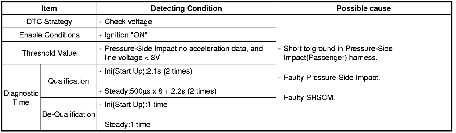 The SCM detects the impact signals of the Pressure-Side Impact Sensor and Rear Side Impact Sensor and compares with signals of the safe sensor inside. If the signals of all sensors are judged as a collision, the side-airbag and the curtain-airbag would be unfolded.