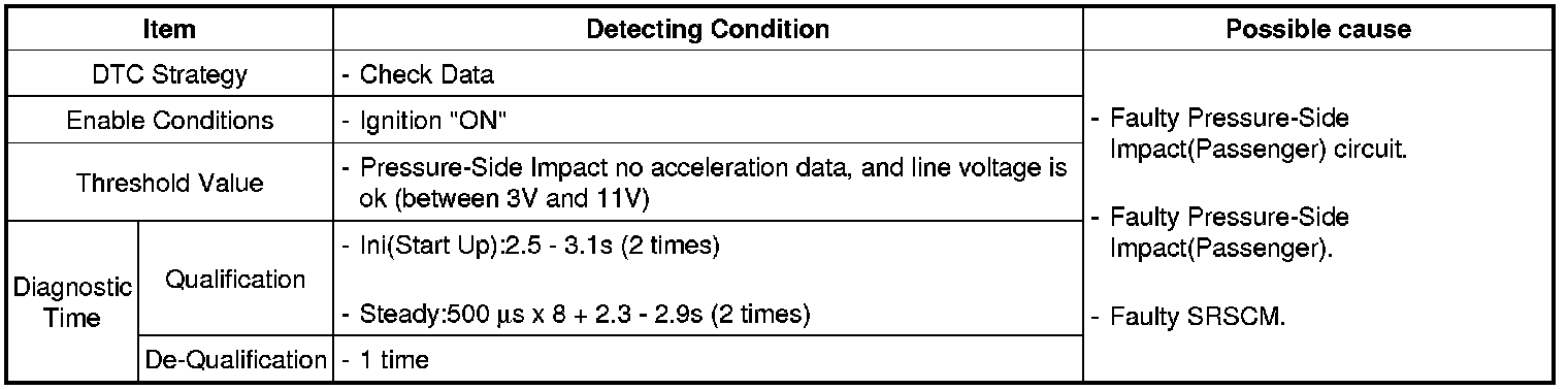 The SCM detects the impact signals of the Pressure-Side Impact Sensor and Rear Side Impact Sensor and compares with signals of the safe sensor inside. If the signals of all sensors are judged as a collision, the side-airbag and the curtain-airbag would be unfolded.