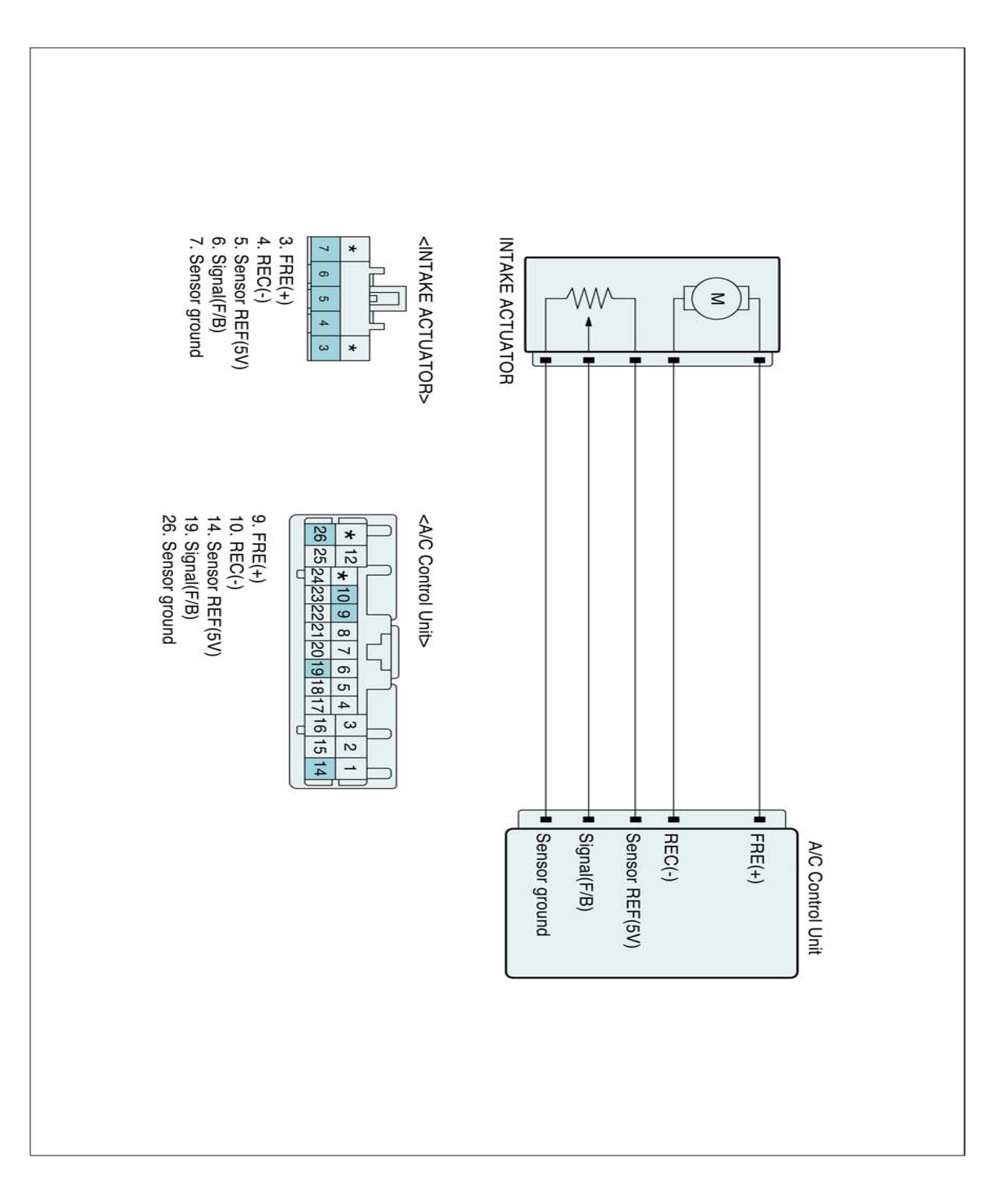 It contains intake motor that changes intake door position and potentiometer that monitors position of intake door. When driver operates the intake switch, ECU receives mode signal from intake switch and operates intake door motor to turn intake door to intended position. (with FRE mode signal, intake door is closed and with REC mode signal, intake door is opened)
