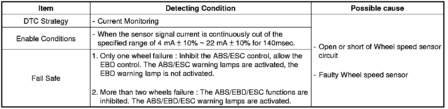 If the sensor signal current is continuously out of the specified range for 140msec, then the HECU determines that the circuit is open/short, and sets this code.