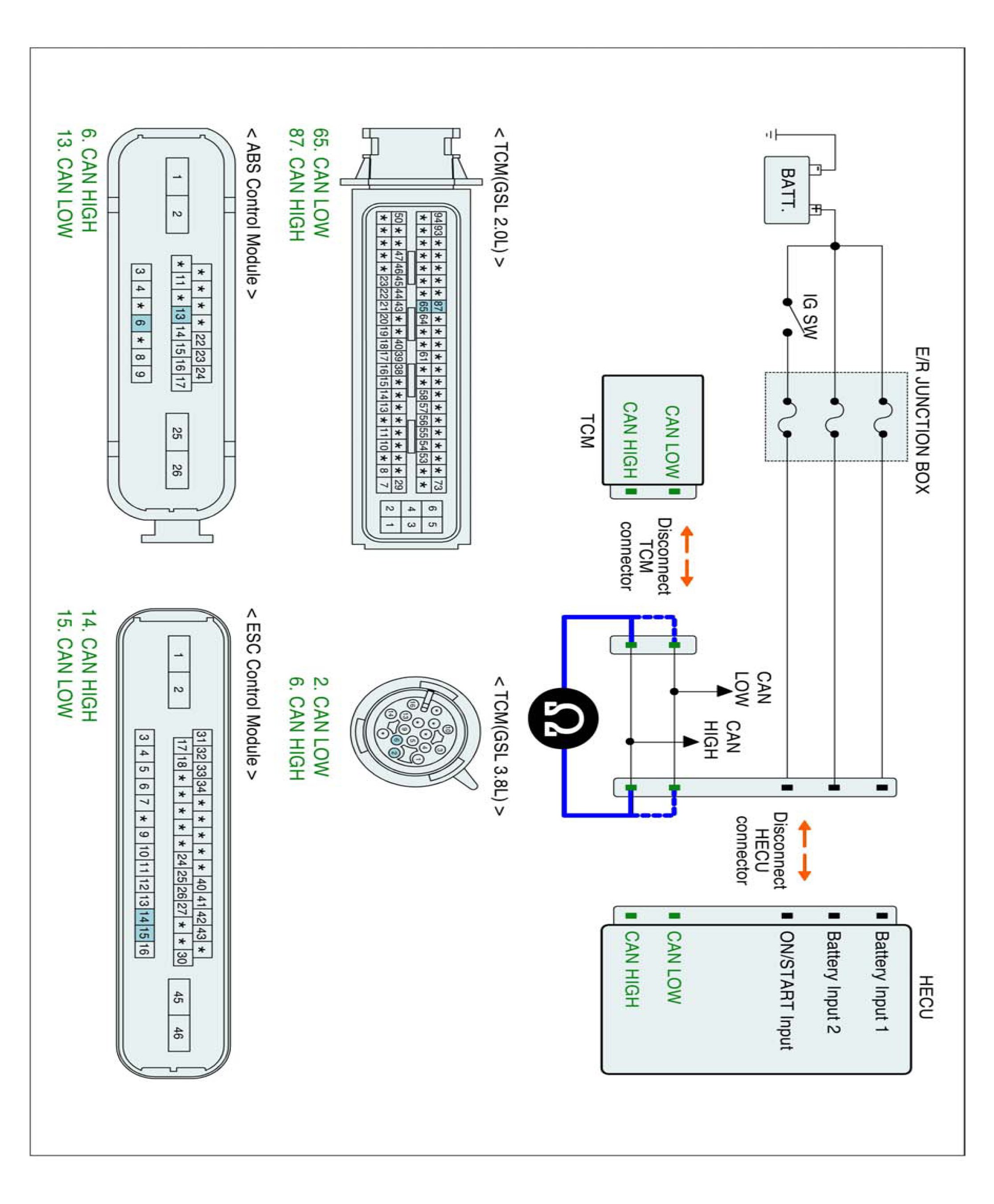 3. Measure resistance between CAN HIGH terminal (LOW terminal) of the HECU harness connector and CAN HIGH terminal (LOW terminal) terminal of the TCM harness connector.