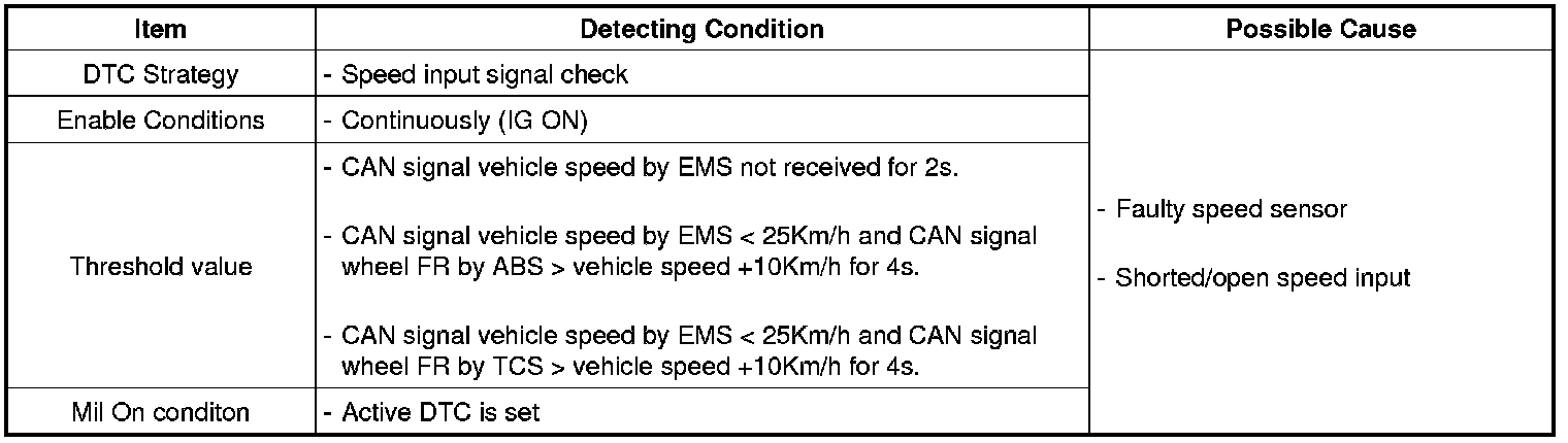 Various TPMS functions rely on a speed signal that reports reliably actual vehicle speed. Three speed signals (ABS1 FR wheel, EMS1 speed signal, TCS5 FR wheel) compared since one signal alone may report incorrect vehicle speed which would go undetected. Three signals must report same vehicle speed. If not, a DTC shall be set to active, and TPMS Warning indicator shall turn on.