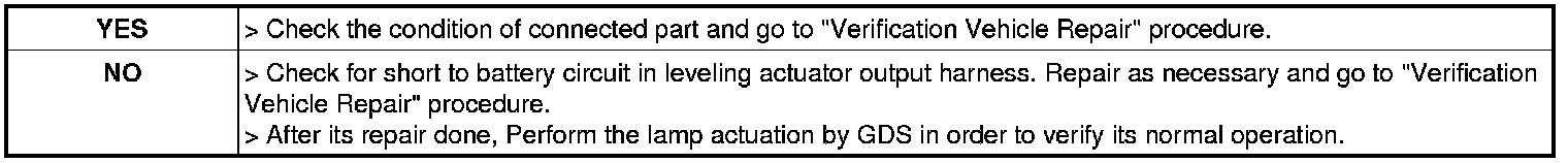 3. Measure resistance between Signal terminal of leveling actuator (LH/RH) harness connector and chassis ground.