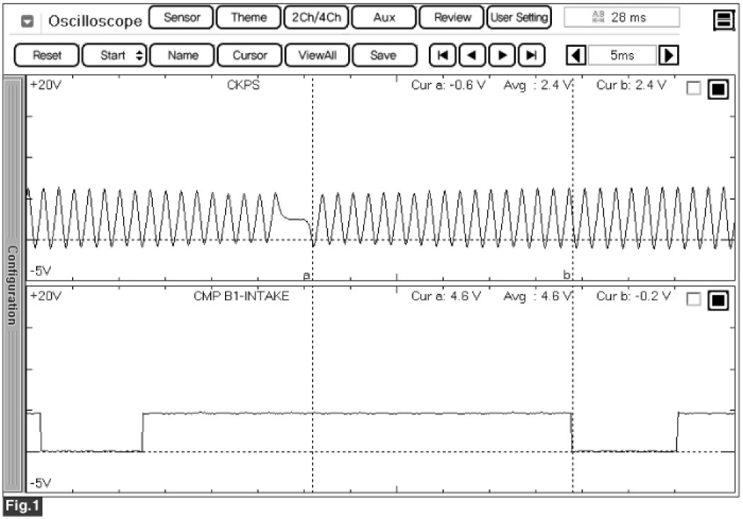 This example shows a typical Crankshaft Position Sensor (CKPS) and Camshaft Position Sensor (CMPS) waveform at idle. (Fig 1.) If the 17th signal of the CKPS after missing tooth is aligned with the high signal of the CMPS at idle, ECM recognizes that Synchronization between CKPS and CMPS is completed. Under accelerating condition, the number of tooth between missing tooth and tooth aligned with edge of the CMPS high signal is decreased than idle condition.