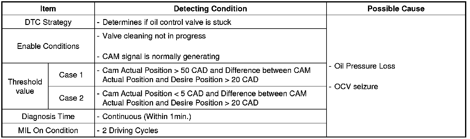 ECM monitors OCV stuck while cam sinal is normally generating and Valve cleaning is not in progress.
