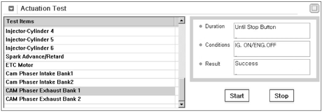 4. Activates "Cam Phaser Intake Bank 2" by pressing "START" button