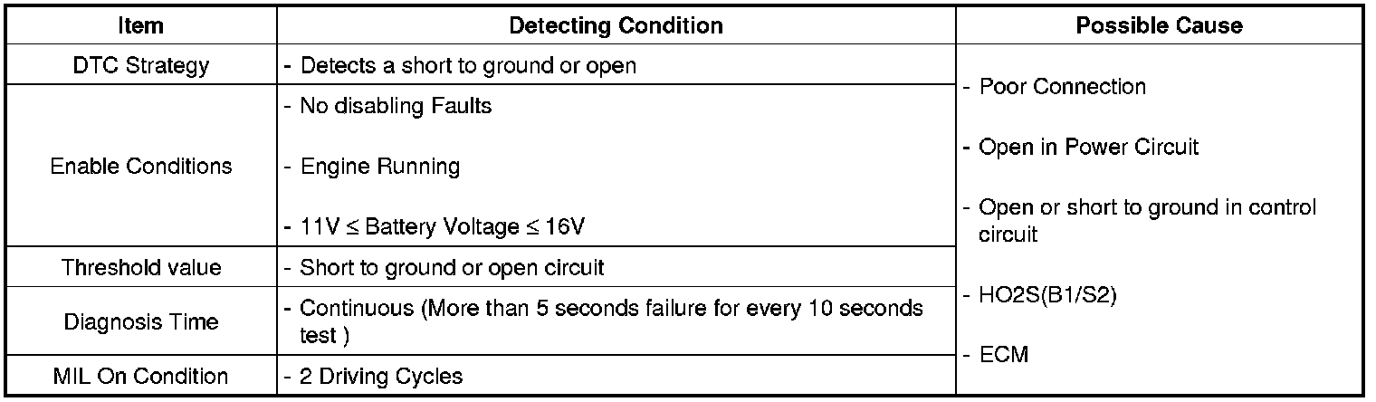 If the ECM detects short to ground or open in heater under detecting conditions, ECM sets P0037. MIL (Malfunction Indication Lamp) turns on when the malfunction lasts till consecutive 2 driving cycle.
