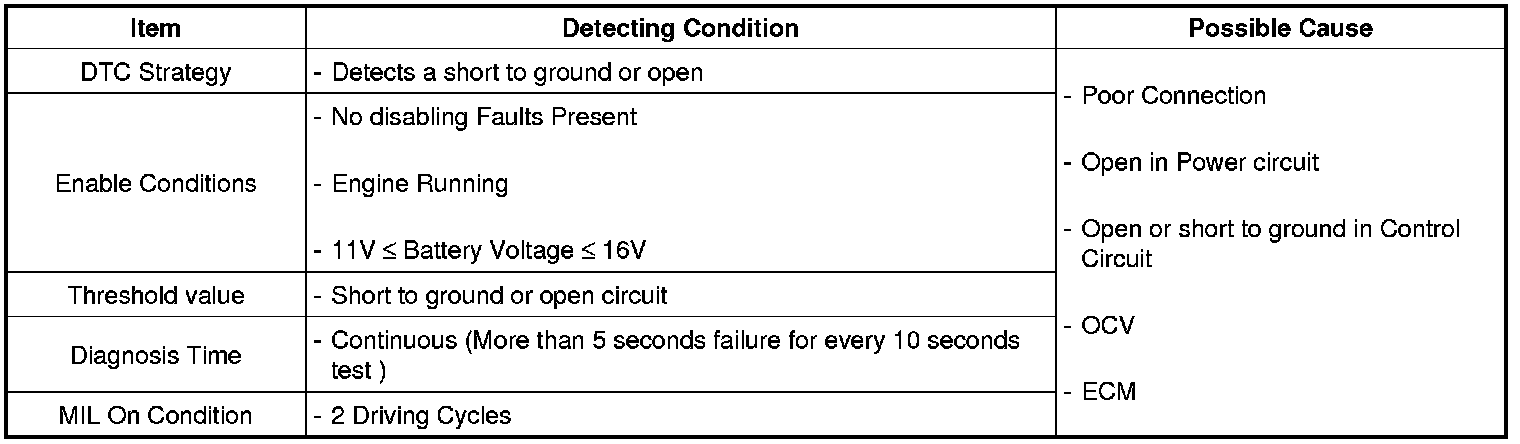 When the enable condition is satisfied The ECM checks that high and low outputs (Voltage level) are observed when OCVs are commanded. When a OCV output failure is detected, the appropriate fail counter is incremented.
