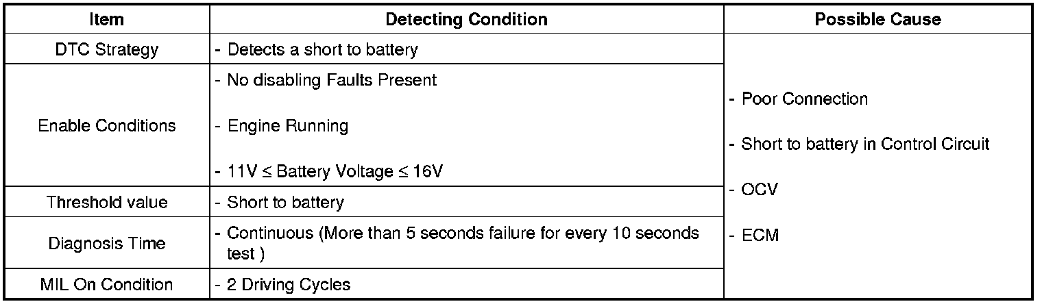 When the enable condition is satisfied The ECM checks that high and low outputs (Voltage level) are observed when OCVs are commanded. When a OCV output failure is detected, the appropriate fail counter is incremented.