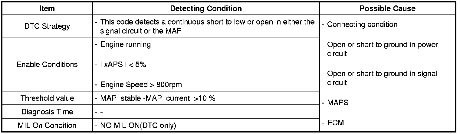 ECM monitors MAP output signal continuously. If there is the signal change over 10% momently without the operation of accel pedal, ECM determines that a fault exists and a DTC is stored.
