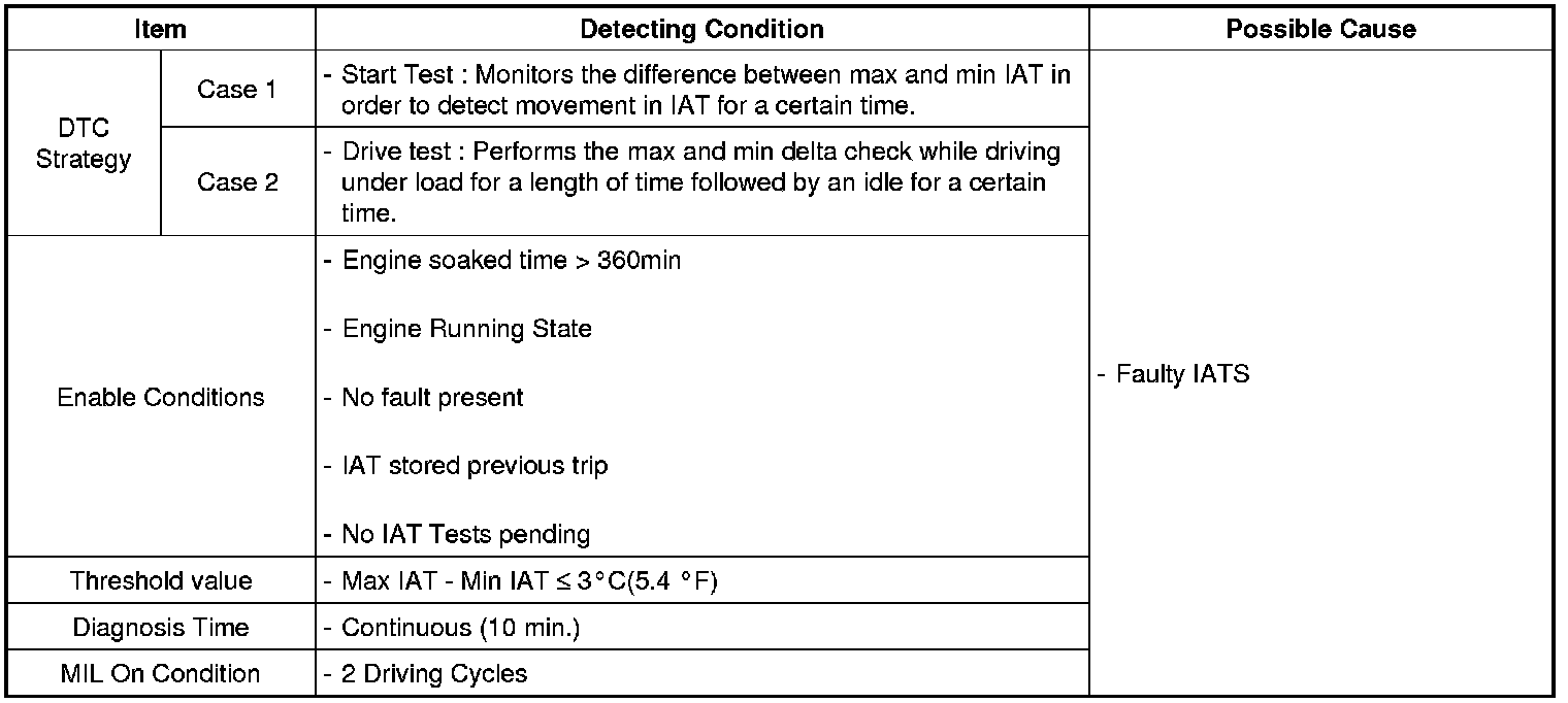 ECM monitors temperature difference between MAX. and MIN IATS in order to detect movement in IATS not only Start Test but Drive Test while enable condition is met. If ECM detects intake air temperature changes less than 5.4 °F ECM determines that a fault exists and a DTC is stored.