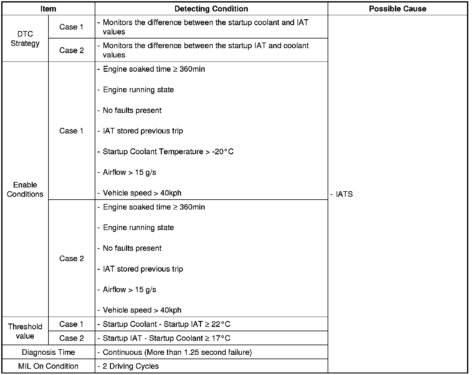 ECM monitors temperature changes resulting from soaking the vehicle. Therefore, Coolant temperature and Intake temperature should be changed. If ECM detects intake air temperature correlated to coolant temperature does not change ECM determines that a fault exists and a DTC is stored. MIL (Malfunction Indication Lamp) turns on when the malfunction lasts till consecutive 2 driving cycle.