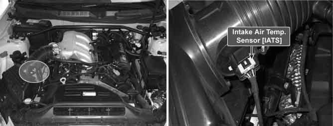 The Intake Air Temperature Sensor (IATS) is installed into the Mass Air Flow Sensor (MAFS). The IATS uses a thermistor whose resistance changes with the temperature. The electrical resistance of the IATS decreases as the temperature increases, and increases as the temperature decreases. The 5 V power source in the ECM is supplied to the IATS via a resistor in the ECM. That is, the resistor in the ECM and the thermistor in the IATS are connected in series. When the resistance value of the thermistor in IATS changes according to the intake air temperature, the signal voltage also changes. Using this signal, the information of the intake air temperature, the ECM corrects basic fuel injection duration and ignition timing.