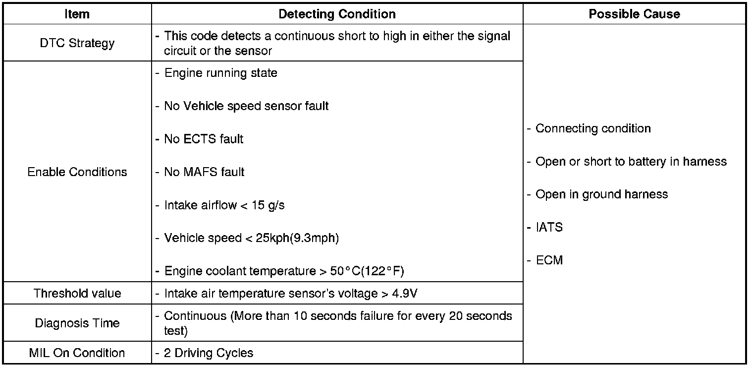 Checking output signals of IATS every 20 sec. under detecting condition, if an output signal is over 4.9 V for more than 10 sec., ECM sets P0113. MIL (Malfunction Indication Lamp) turns on when the malfunction lasts till consecutive 2 driving cycle.