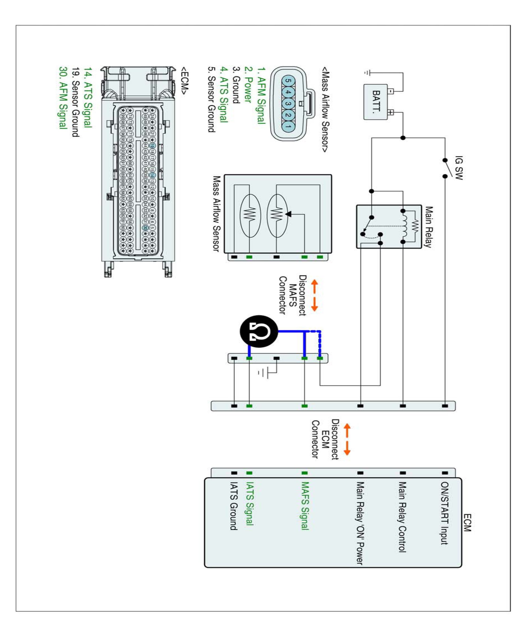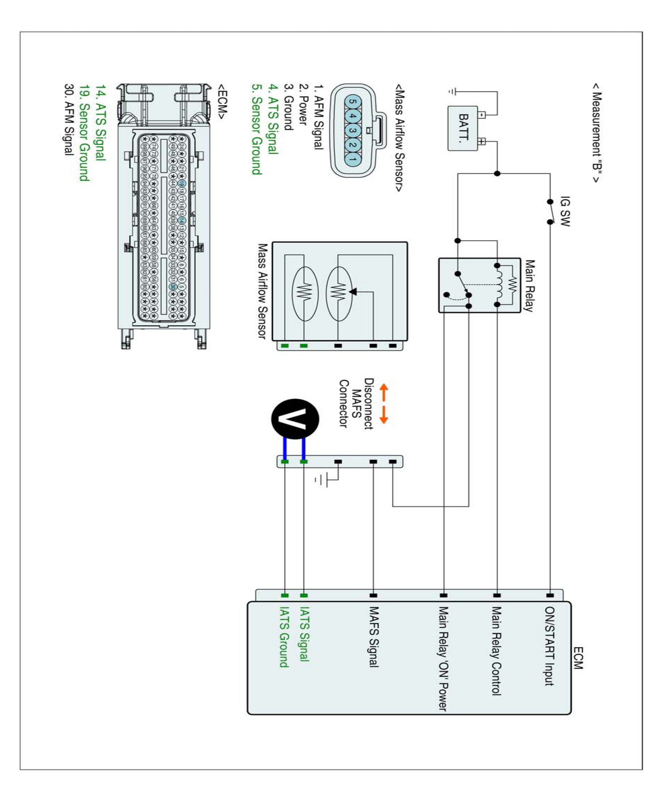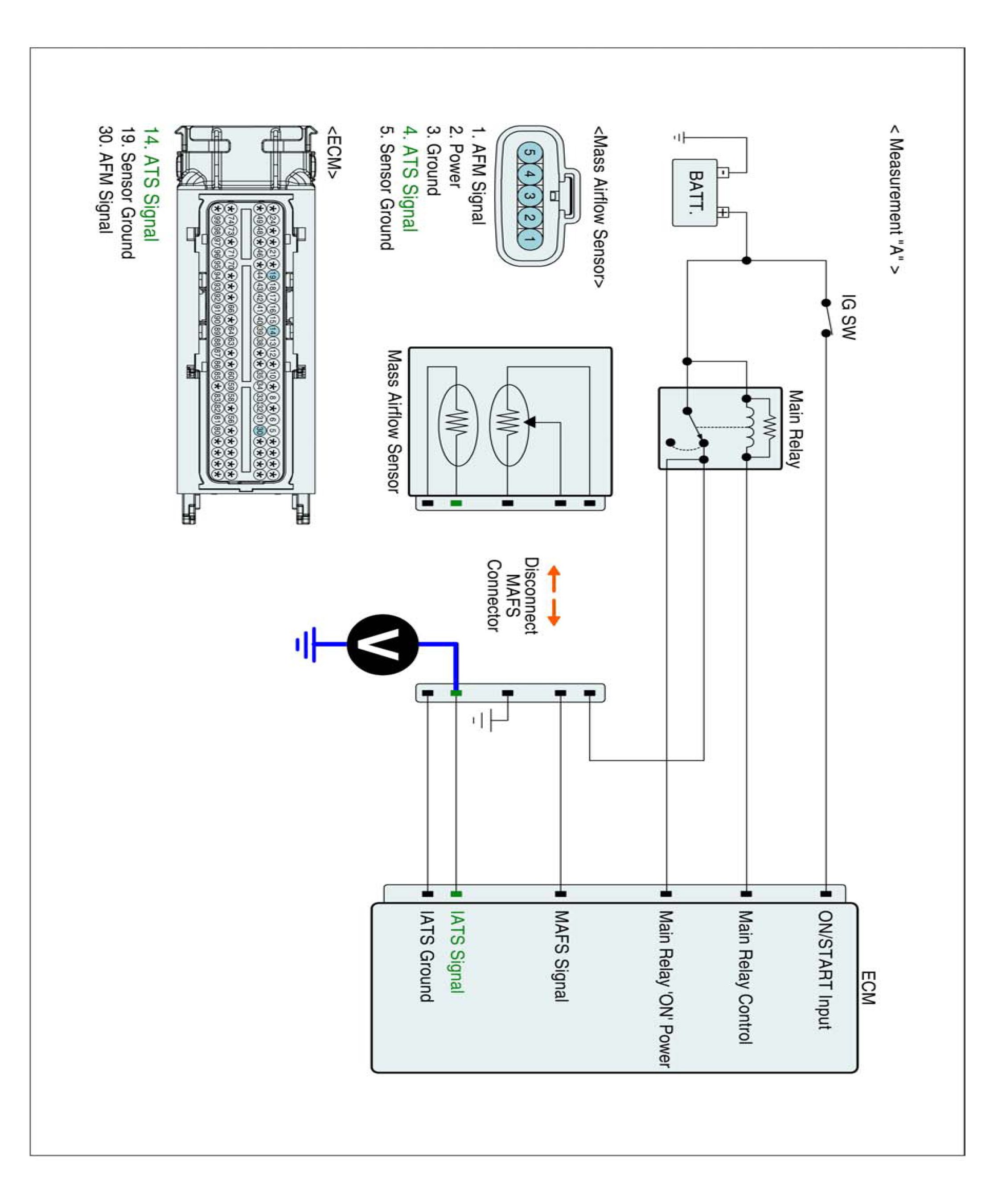 2. Measure resistance between signal terminal of IATS harness connector and power terminal of MAFS harness connector.