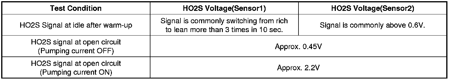 After warming-up, if accelerator pedal is released suddenly around 4000 rpm, the HO2S signal reading will be lower than 200mV resulting from Fuel cut-off for the moment. Conversely, if suddenly accelerator pedal is depressed, HO2S signal reading will be around 0.6 V ~1.0 V. At idle, Normally HO2S signal will switch from lean to rich with 3 Hz. And as racing, Its frequency rises.