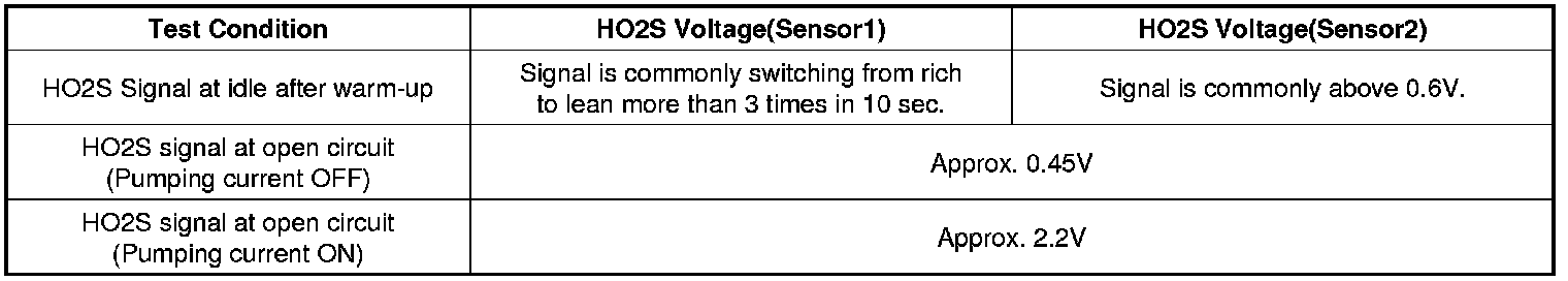 After warming-up, if accelerator pedal is released suddenly around 4000 rpm, the HO2S signal reading will be lower than 200mV resulting from Fuel cut-off for the moment. Conversely, if suddenly accelerator pedal is depressed, HO2S signal reading will be around 0.6 V ~1.0 V. At idle, Normally HO2S signal will switch from lean to rich with 3 Hz. And as racing, Its frequency rises.