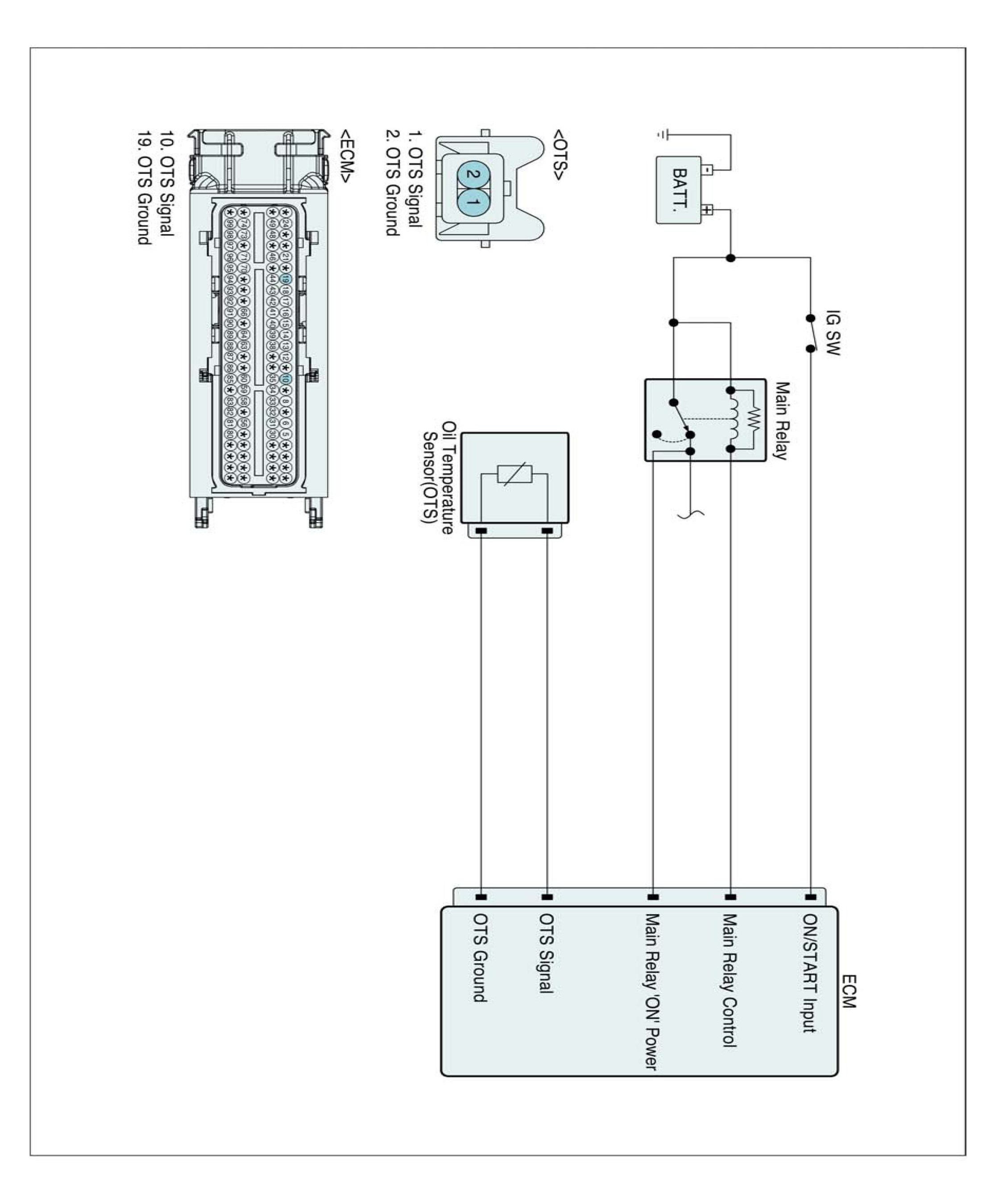 Checking the oil temperature, coolant temperature and intake air temperature every 25 sec. under detecting condition, if the difference in temperature at start-up exceeds threshold value, ECM sets P0196. MIL (Malfunction Indicating Lamp) turns on when the malfunction lasts till consecutive 2 driving cycle.