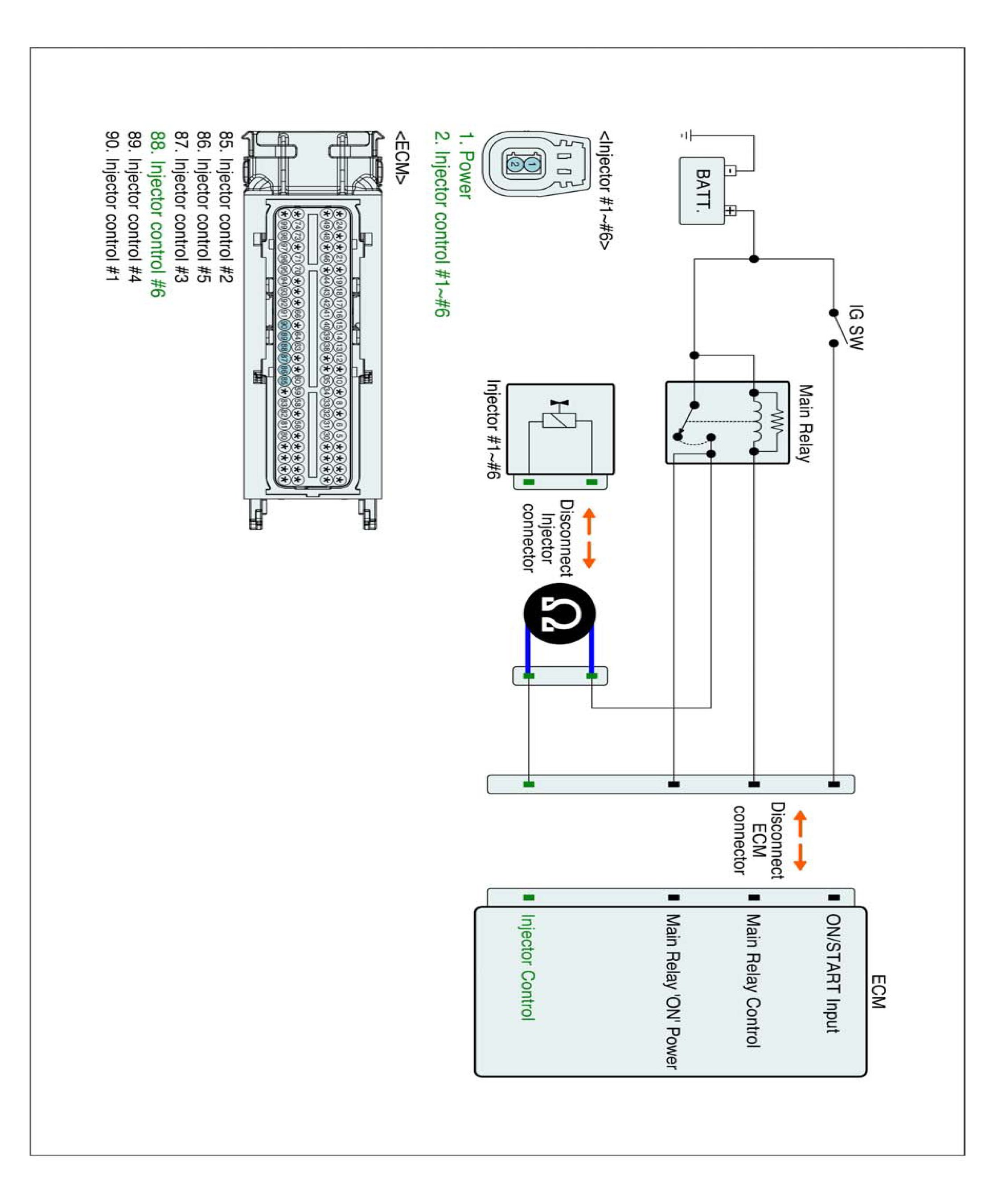 1. IG "OFF" and disconnect injector connector and ECM connector.