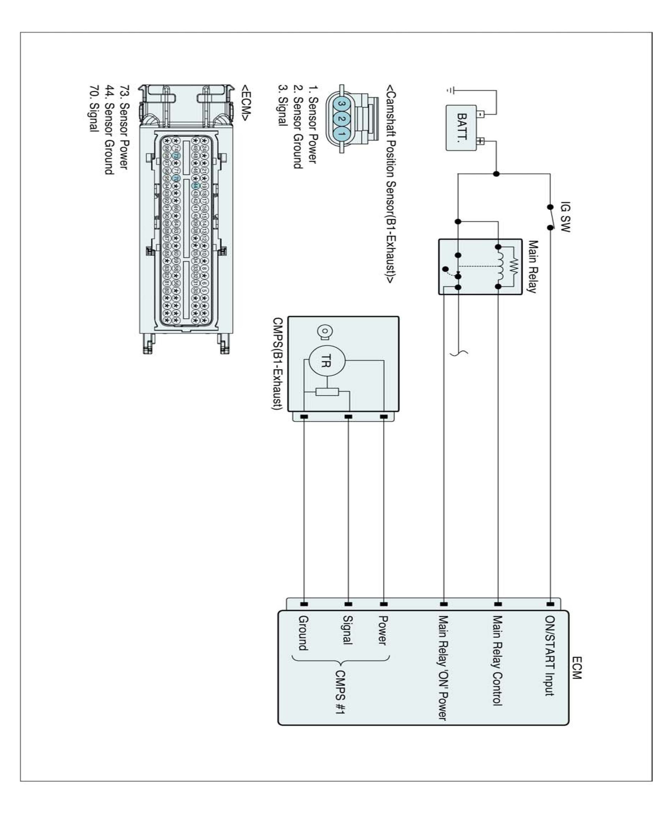 The Camshaft Position Sensor (CMPS) is a sensor that detects the compression TDC of the NO. 1 cylinder. The CMPS consists of a hall type sensor and a target on the end of the intake camshaft. When the target triggers the sensor, the sensor voltage is 5 V. If not, the sensor voltage is 0 V. These CMPS signal is sent to the ECM and the ECM uses the CMPS signal for synchronizing the firing of sequential fuel injectors.