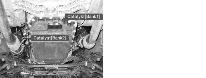 The ECM uses dual oxygen sensors to monitor the efficiency of the manifold catalytic converter (warm-up catalytic converter). By monitoring the oxygen storage capacity of a catalyst, its efficiency can be indirectly calculated. The upstream (front) HO2S is used to detect the amount of oxygen in the exhaust gas before it enters the catalytic converter. A low voltage indicates high oxygen contents (lean air mixture). A high voltage indicates low oxygen contents (rich air mixture). When the catalyst efficiency drops, no chemical reaction takes place. This means the concentration of oxygen will be the same at the rear as it is at the front.
