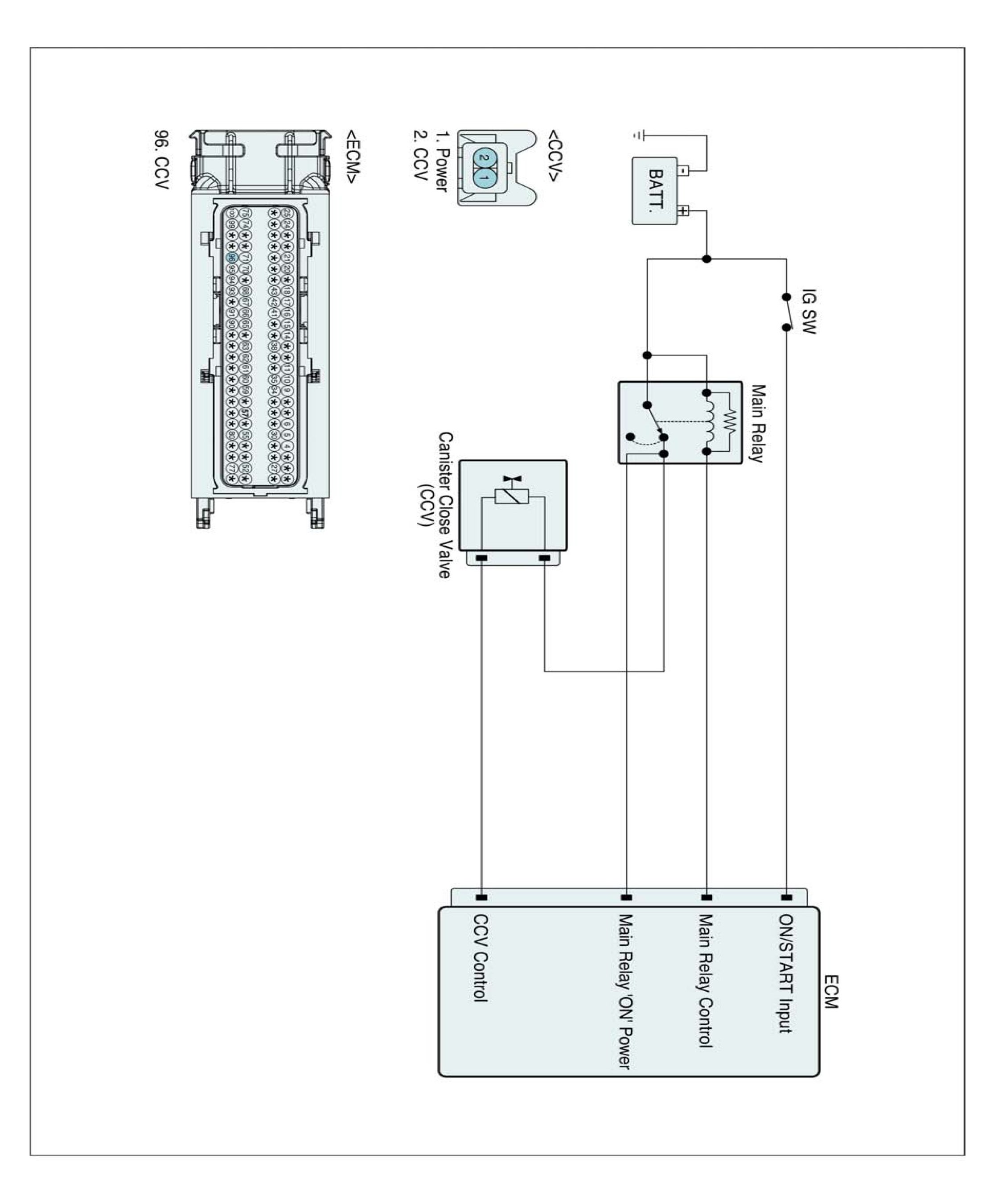 The evaporative emissions system prevents hydrocarbon (HC) vapors from the fuel tank from escaping into the atmosphere where they could form photochemical smog. Gasoline vapors are collected in the charcoal canister. The Canister Closing Valve (CCV) closes off the air inlet into the canister for leak detection of the evaporative emission system. The CCV also prevents fuel vapors from escaping from the canister. When the engine purges the HC vapors from the canister, the clean air comes into the canister through the canister air-filter and the CCV.