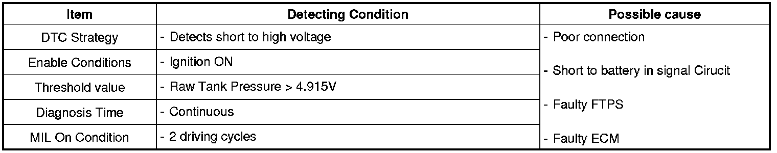 Checking output signals of fuel tank pressure sensor under detecting condition, if the tank pressure is higher than threshold, ECM sets P0453. MIL (Malfunction Indication Lamp) turns on when the malfunction lasts till consecutive 2 driving cycle.