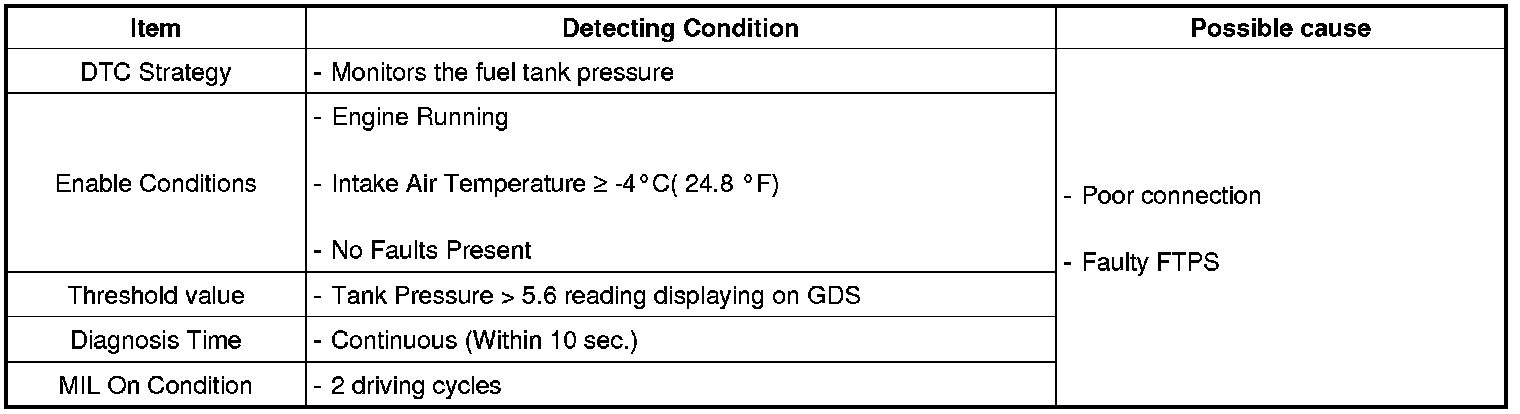 Checking output signals from FTPS under detecting condition, if the FTPS indicates pressure momentarily increased more than 5.6 reading displaying on scantool, ECM sets P0454. MIL (Malfunction Indication Lamp) turns on when the malfunction lasts till consecutive 2 driving cycle.