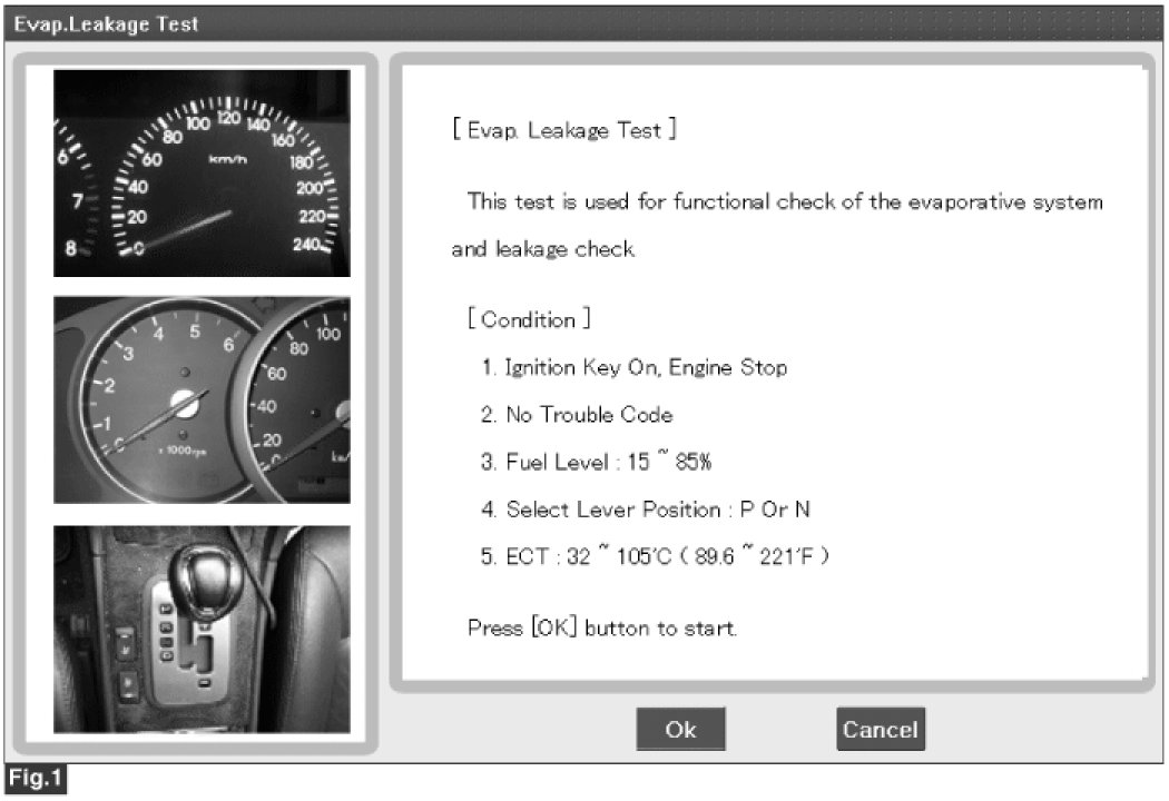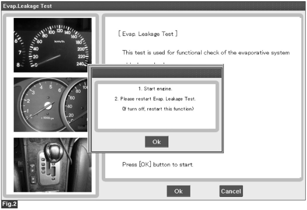 5. If OK, Start engine and restart Evap.Leakage Test again[Fig 2].