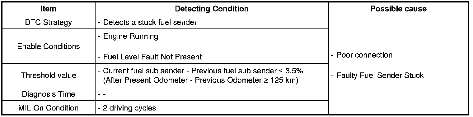 Checking fuel level change under detecting condition, if the fuel level difference between current and previous is lower than 3.5% while odometer difference between present and previous is higher than 125 km, ECM sets P0461. MIL (Malfunction Indication Lamp) turns on when the malfunction lasts till consecutive 2 driving cycle.