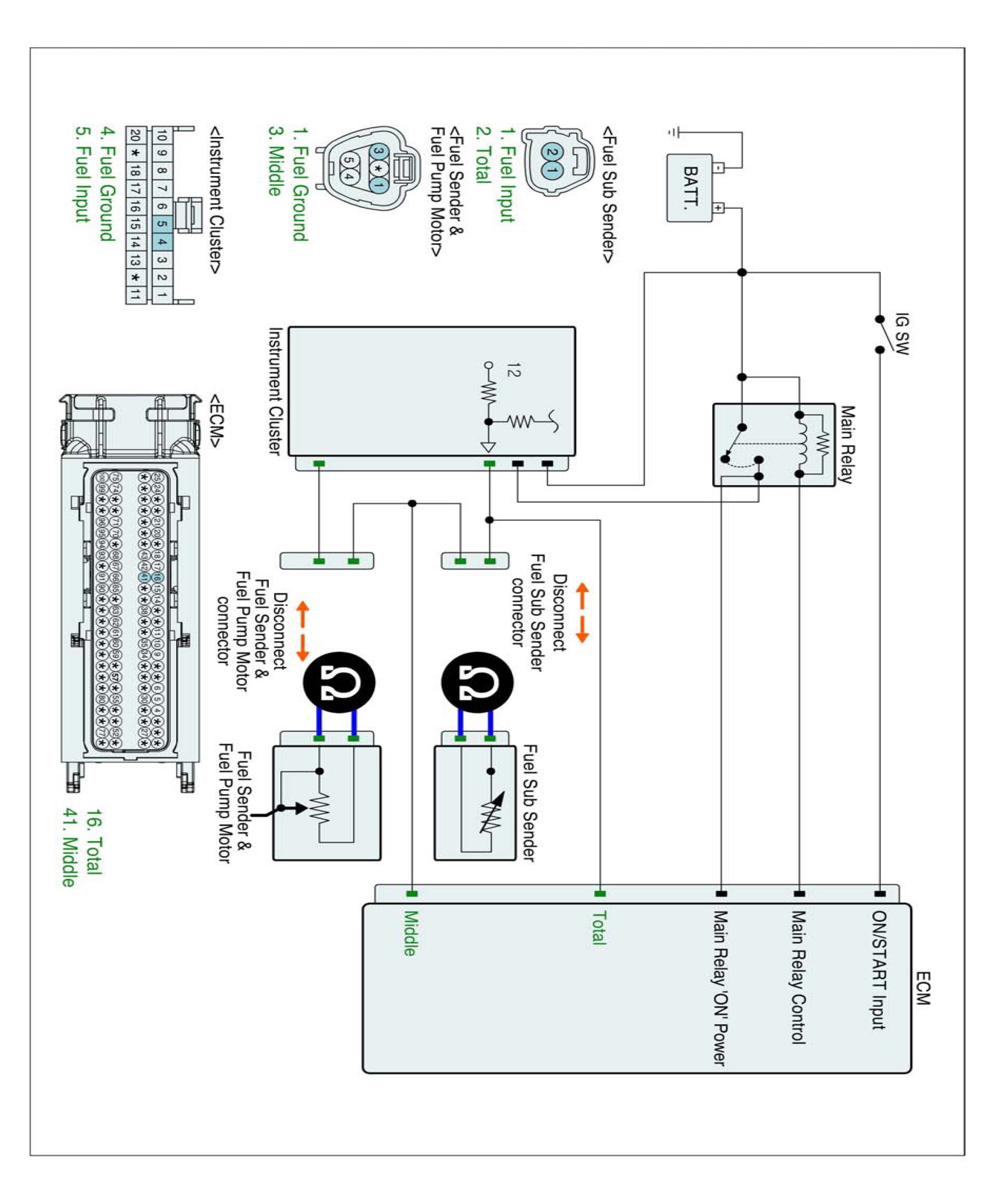 1. IG "OFF" and Disconnect Fuel Sender & Fuel Pump Motor connector.