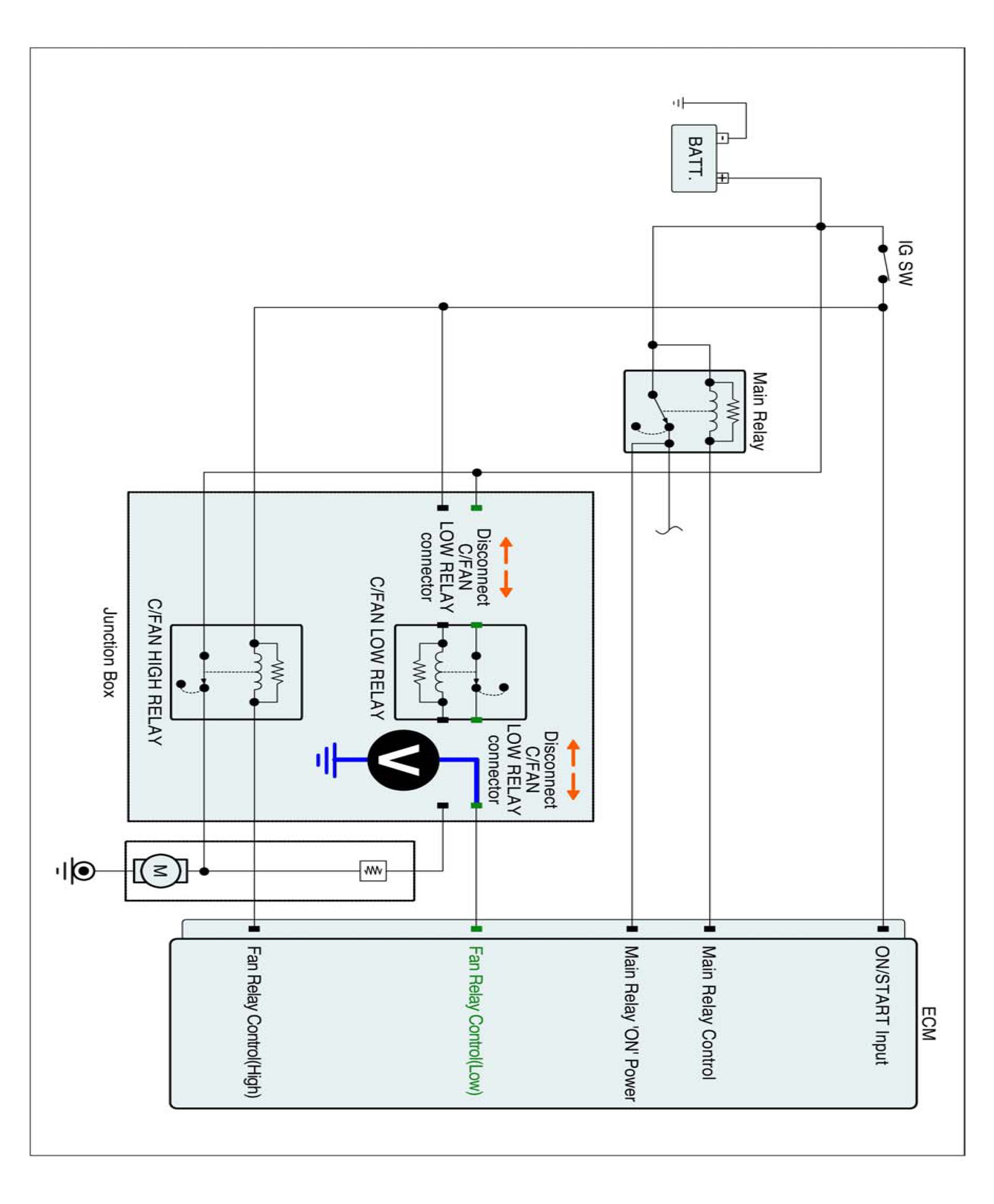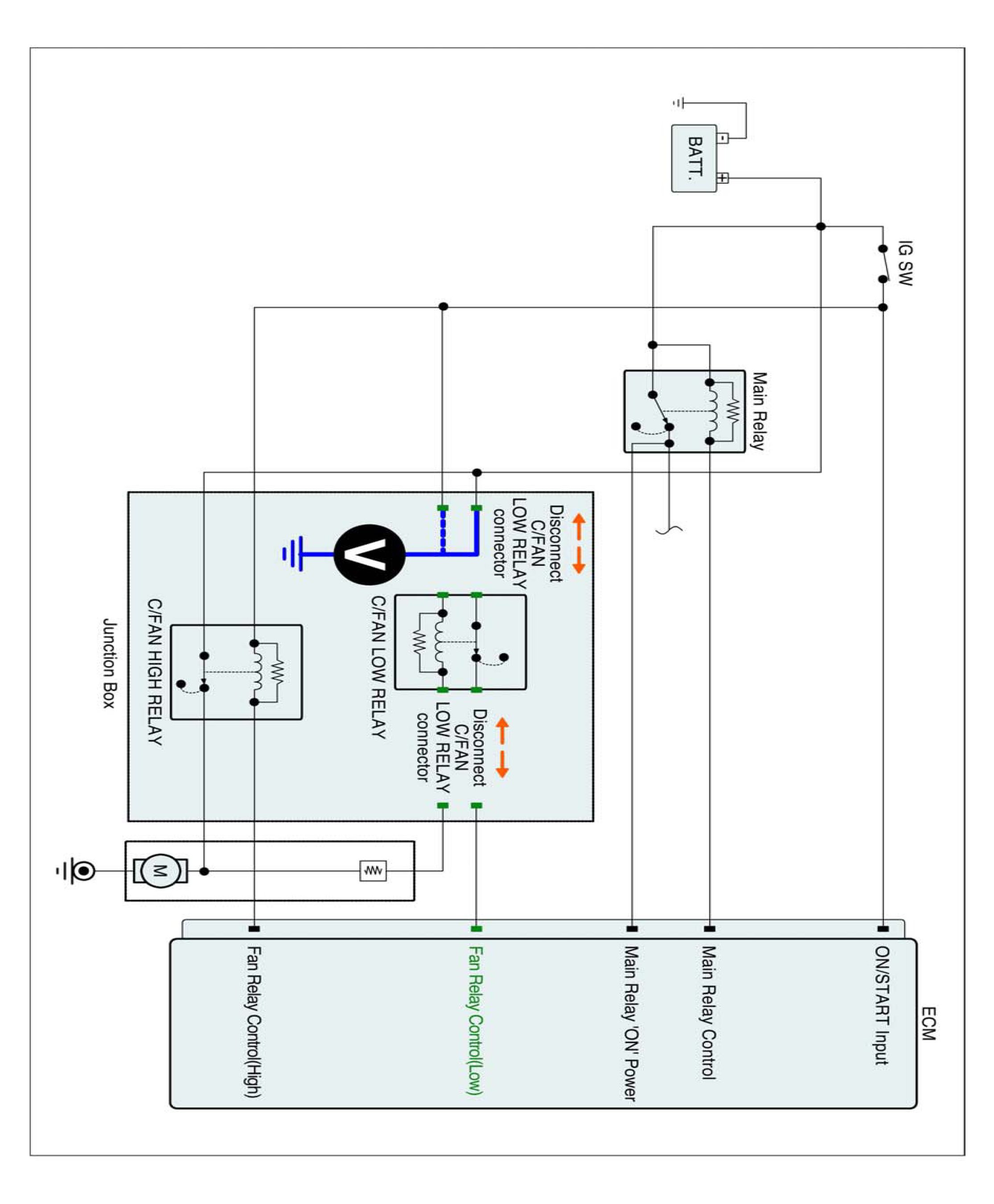 1. IG "OFF" and disconnect Cooling fan relay (low).
