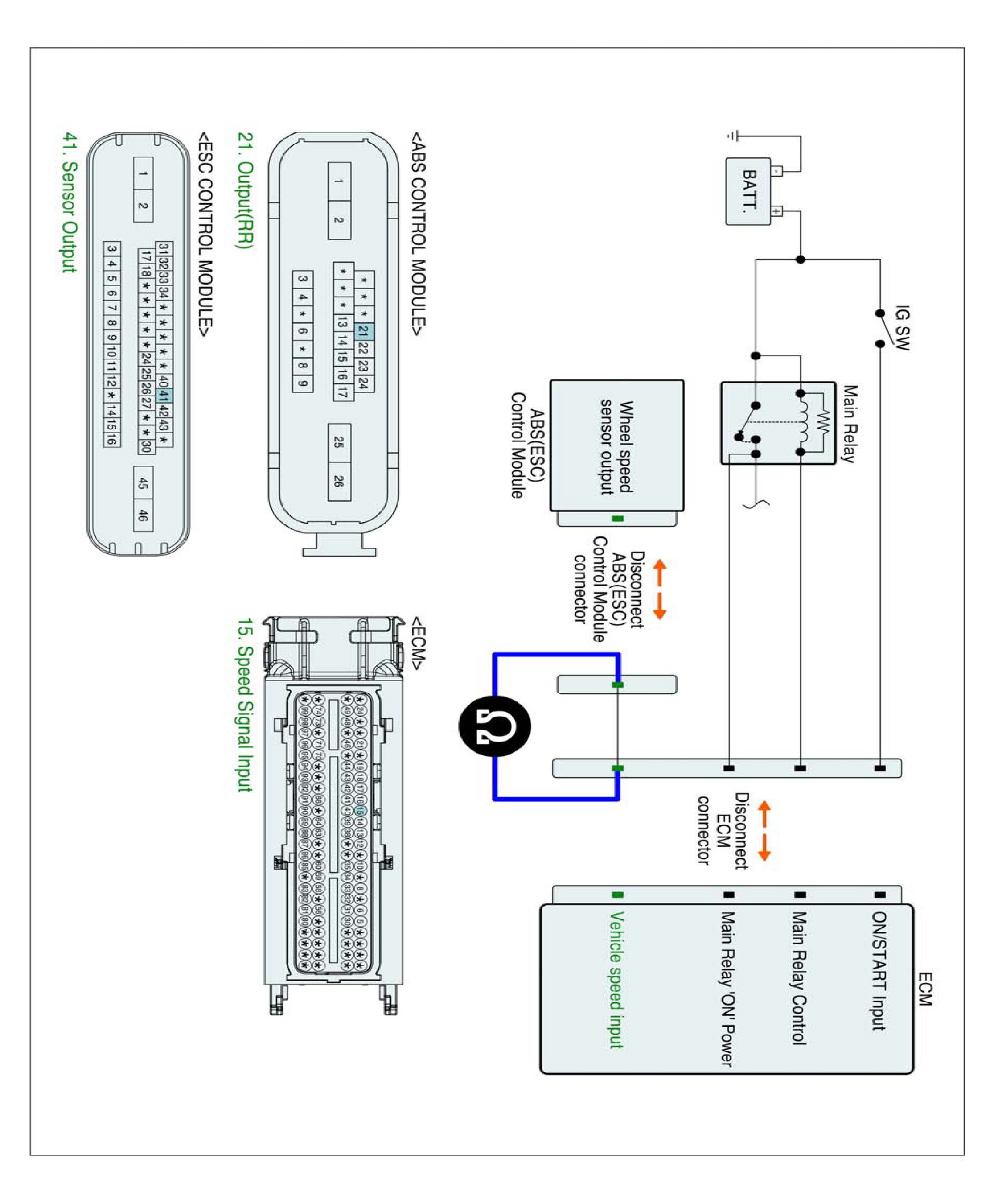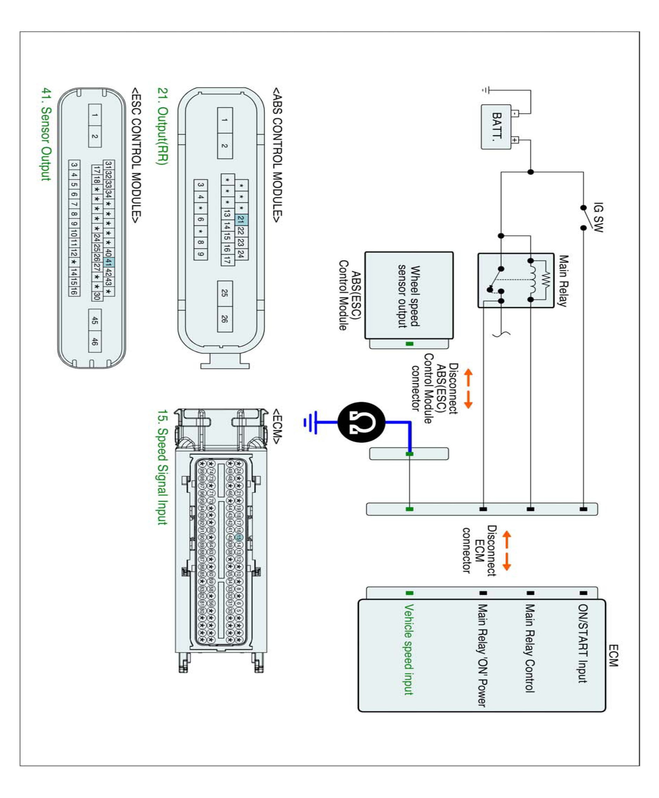 1. IG "OFF" and disconnect ECM connector and ABS (ESC) control module connector.