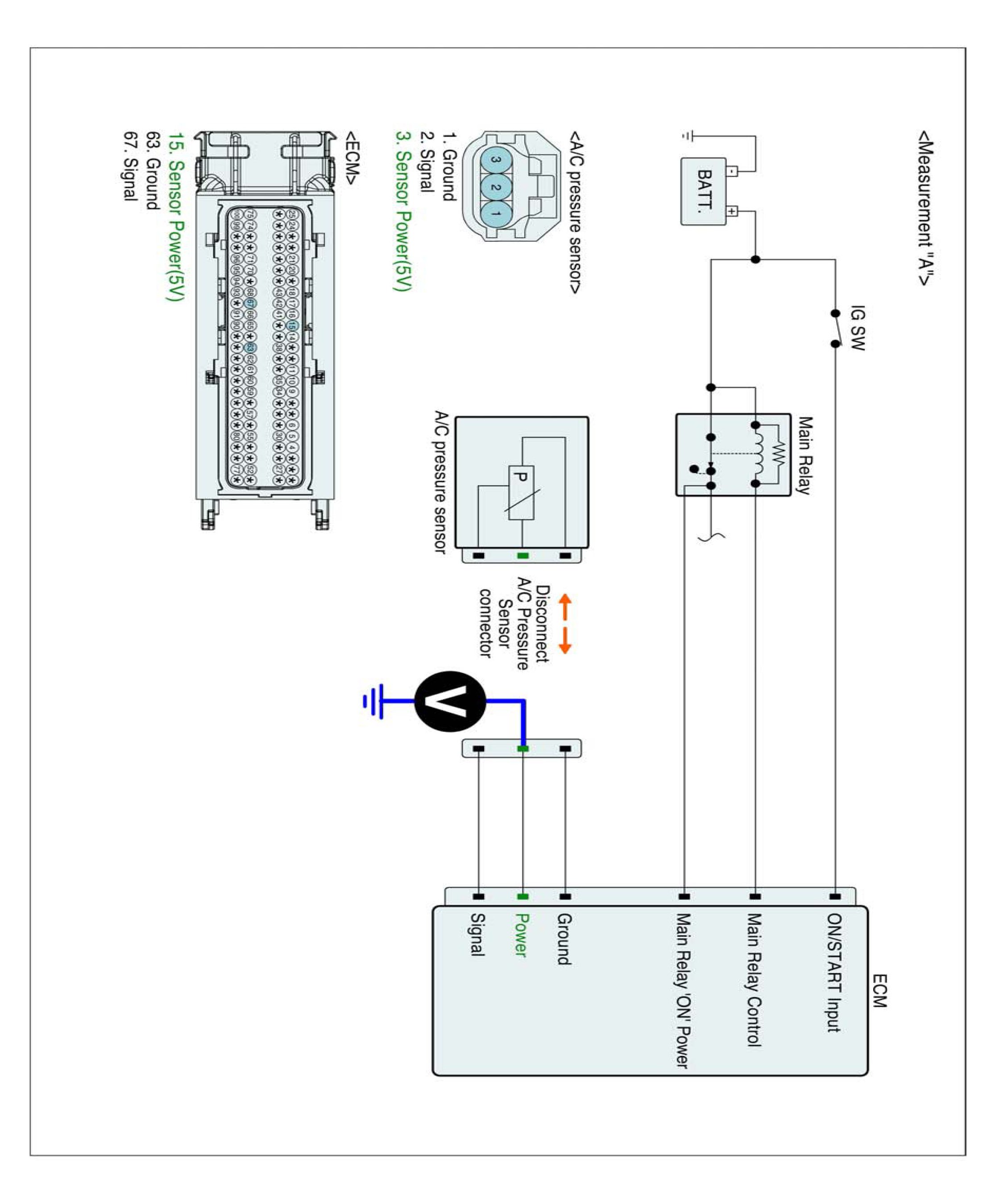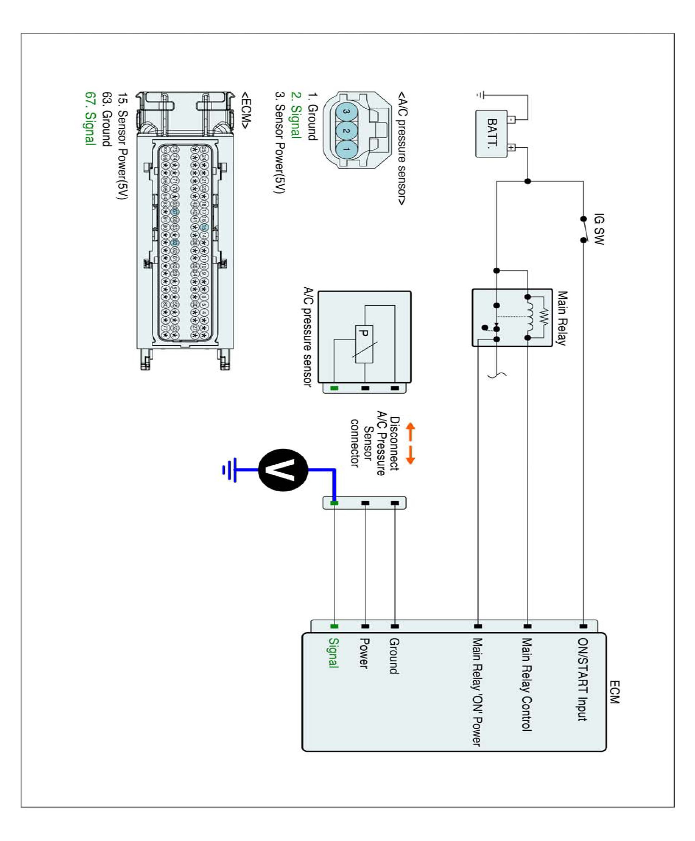 1. IG "OFF" and disconnect A/C pressure sensor and ECM connector.